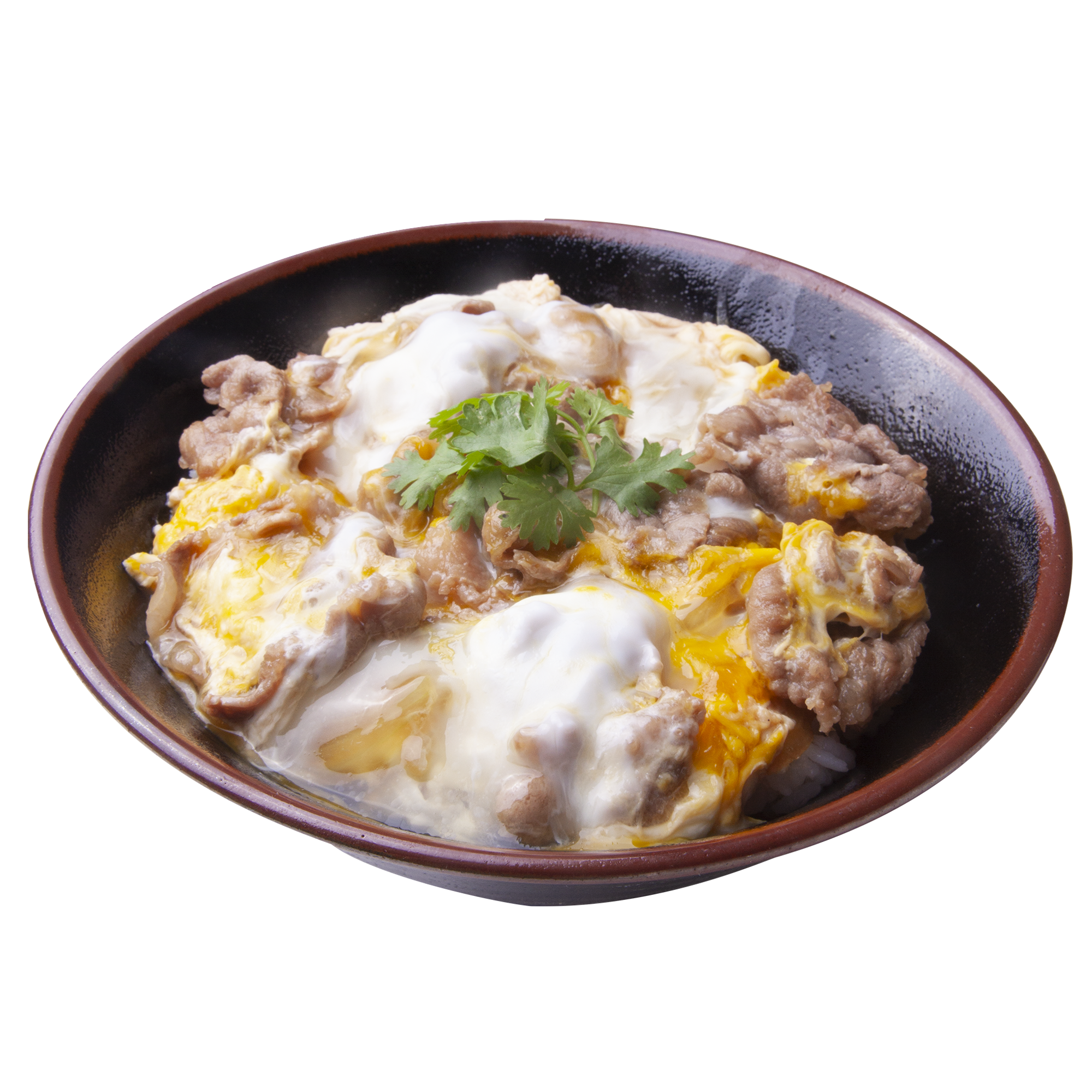 Japanese rice topped with submerged thinly-sliced sauteed beef, egg, and leeks
